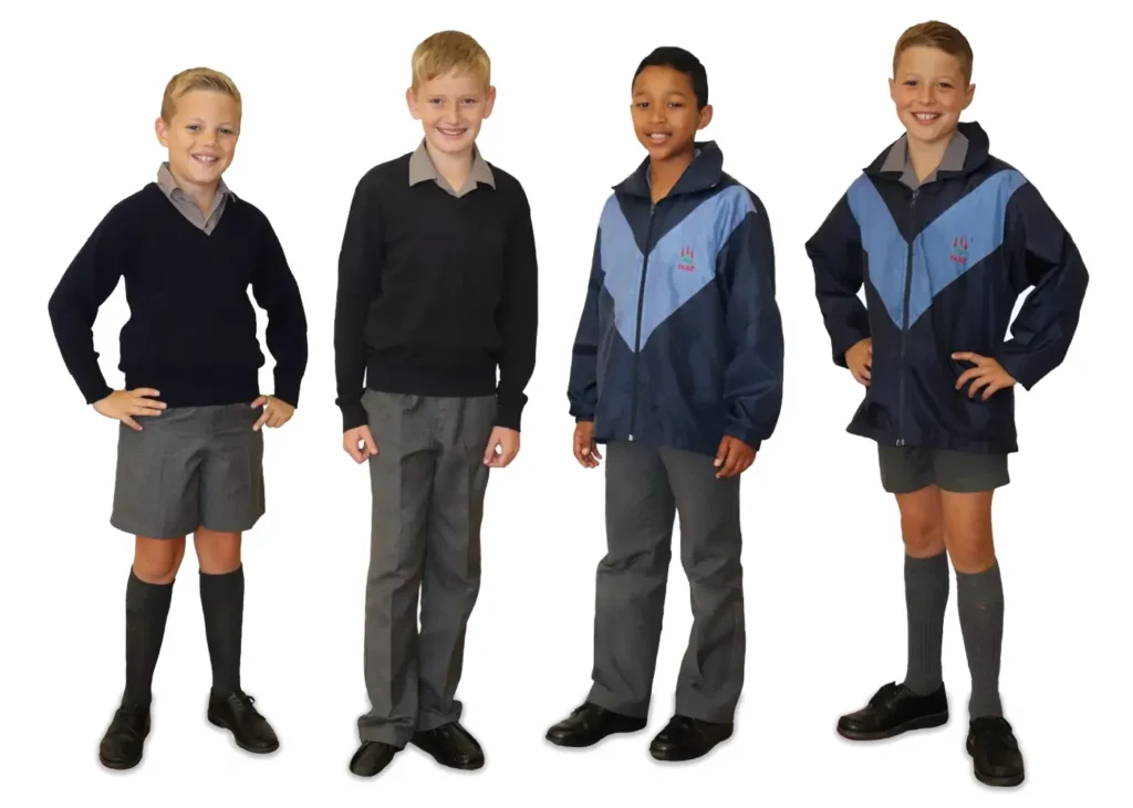 - Dit kan gedra word met ‘n meegaande donkerblou skoolsweetpakbroek en skoolreënbaadjie met oorwegend wit tekkies.
